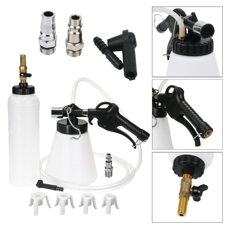 Il comprend un purgeur de freins de 1 litre, une bouteille de rechange de 0.75 litres avec fermeture de sécurité, un crochet pour suspendre, un tuyau en silicone de 2 mètres, un raccord rapide pour compresseur et 4 adaptateurs.