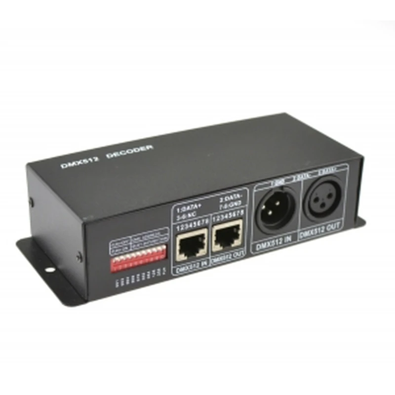 The decoder comes with 2 connectors for linking to a DMX512 console or for passing the signal on to another controller. The connection typically uses screw terminals, compatible with the standard 3-wire DMX512 signal (Data+, Data-, GND). XLR connectors are not included, so in professional installations adapters may be required if consoles use that format.