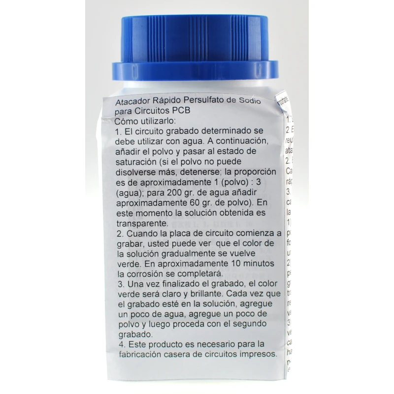 Ce produit est un graveur rapide spécialement formulé pour la gravure de circuits imprimés (PCB) à la maison ou dans des ateliers électroniques. Le persulfate de sodium est un solide qui, une fois dissous dans l'eau, crée une solution transparente permettant de corroder le cuivre rapidement et efficacement en environ 10 minutes.